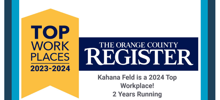 ORANGE COUNTY – Dec. 31, 2024 – Kahana Feld is pleased to announce that the firm has been named a 2024 Top Workplace by the Orange County Register. This is the second year in a row that Kahana Feld has been named to the Orange County Top Workplaces list.