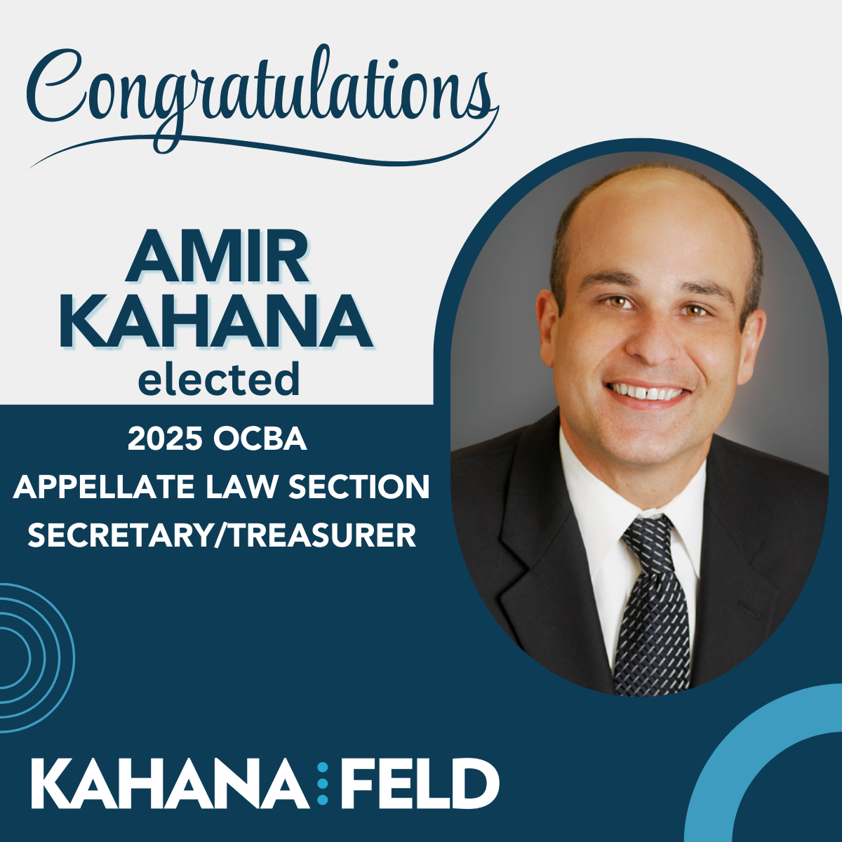 Kahana Feld is pleased to announce that Firmwide Managing Partner Amir Kahana has been elected the 2025 Secretary/Treasurer of the Orange County Bar Association (OCBA) Appellate Law Section. In this role, Amir will move to...